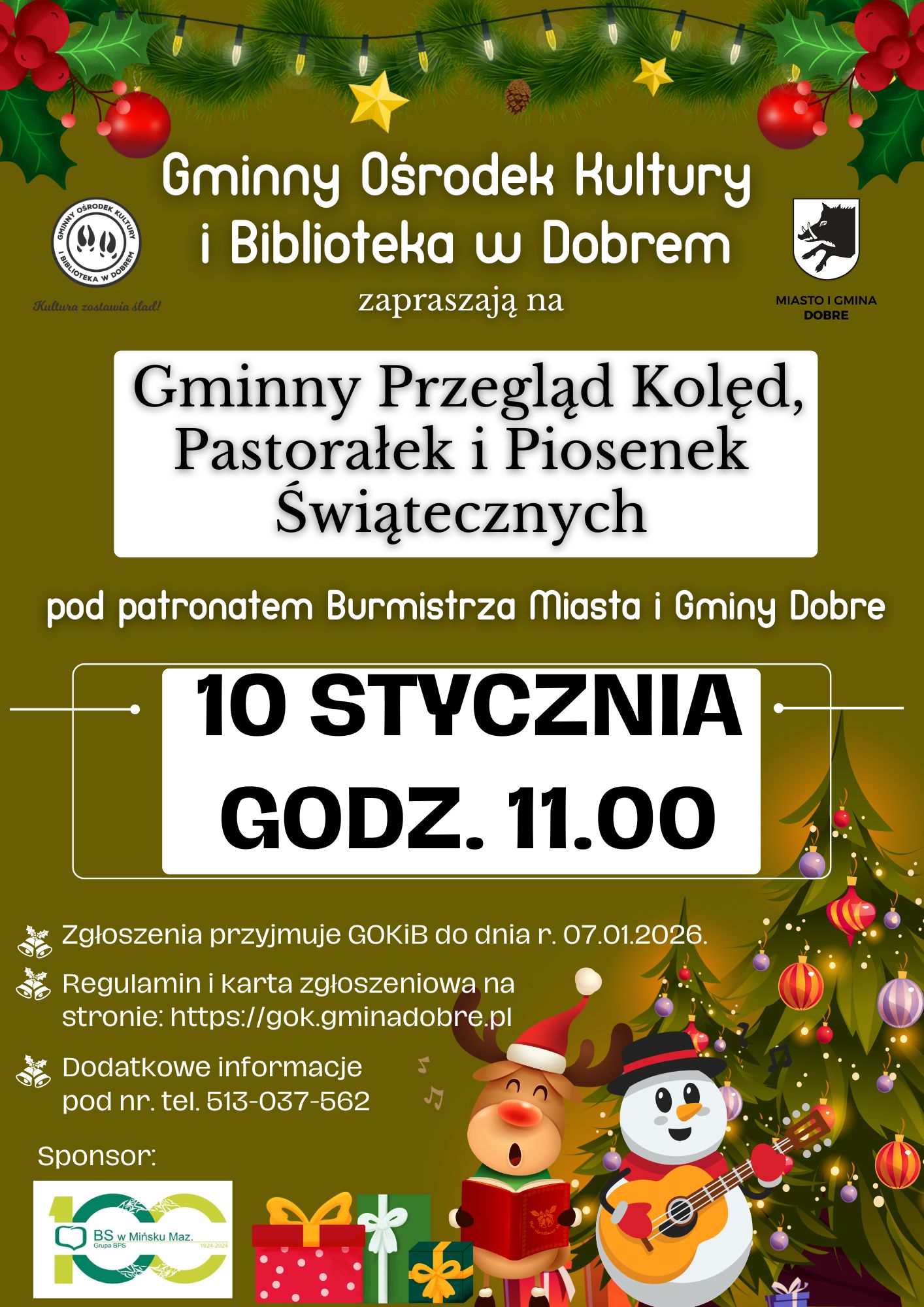 Gminny Ośrodek Kultury i Biblioteka w Dobrem zapraszają mieszkańców Miasta i Gminy Dobre do udziału w Gminnym Przeglądzie Kolęd, Pastorałek i Piosenek Świątecznych, organizowanym pod patronatem Burmistrza Miasta i Gminy Dobre.