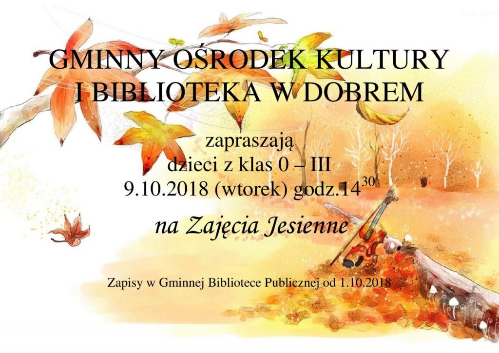 Gminny Ośrodek Kultury i Biblioteka w Dobrem zapraszają dzieci z klas 0 – III 9.10.2018 (wtorek) godz. 14:30 na Zajęcia Jesienne.