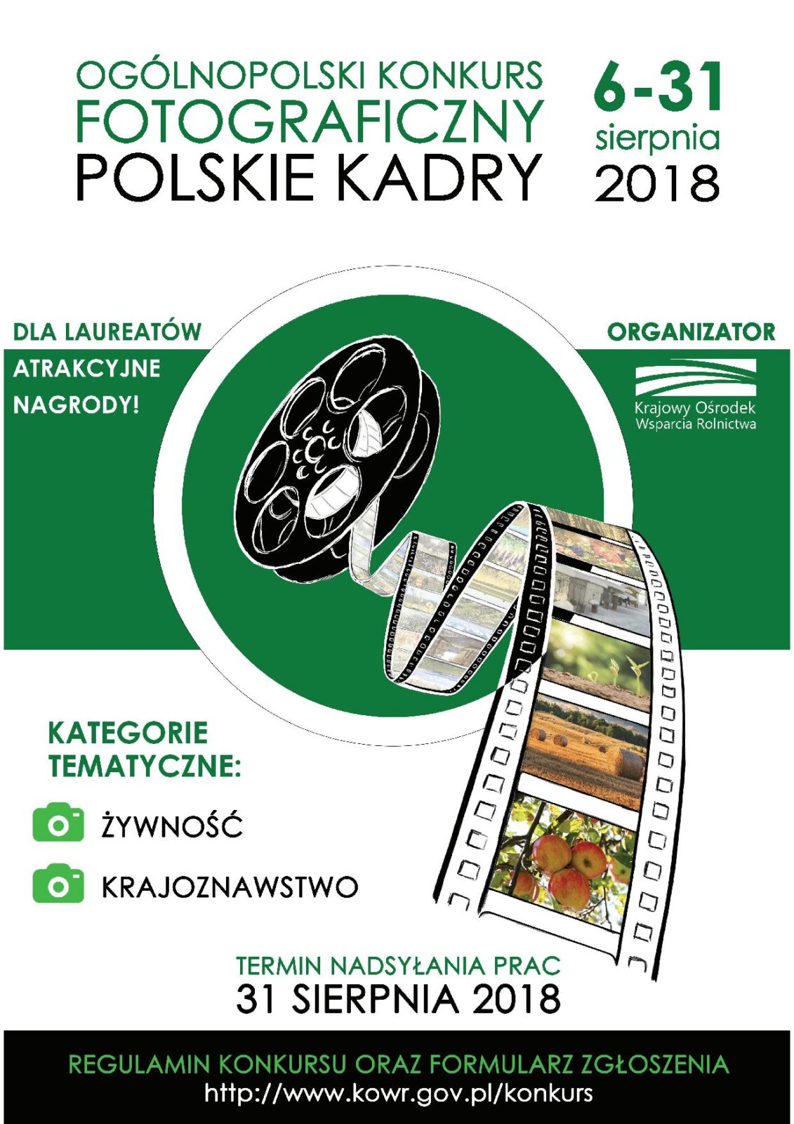 „Polskie kadry” to ogólnopolski konkurs fotograficzny organizowany przez Krajowy Ośrodek Wsparcia Rolnictwa. Termin nadsyłania prac upływa 31 sierpnia 2018 r. Celem konkursu jest ukazanie bogactwa regionów Polski w dwóch kategoriach tematycznych: żywnościowej i krajoznawczej.