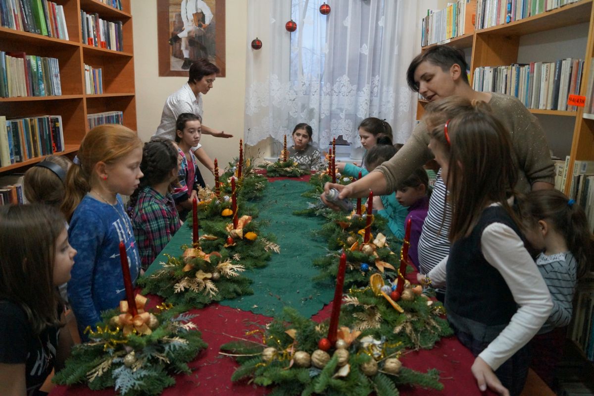 W sali Gminnej Biblioteki Publicznej zorganizowano dla dzieci wspólne robienie dekoracji świątecznych. W ubiegłym roku dzieci uczyły się piec i ozdabiać świąteczne pierniczki. Tym razem zajęliśmy się stroikami na stół wigilijny. Każde dziecko z wcześniej przygotowanych materiałów wykonało stroik z pachnącego świerku, ozdobiło go świeczką, bombeczką, suszonymi owocami i różnymi świecącymi pięknościami. Podczas pracy dzieci śpiewały kolędy co sprawiło że poczuły ducha świąt. Po skończonych zajęciach dzieci zabrały stroiki, aby udekorować wigilijne stoły w swoich domach.