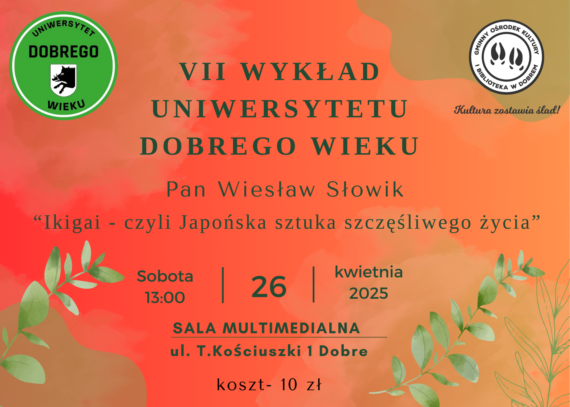 26 kwietnia 2025 r., o godz. 13:00 w sali konferencyjnej Urzędu Miasta i Gminy Dobre odbędzie się wykład UDW pt. „Ikigaj – czyli Japońska sztuka szczęśliwego życia”, który poprowadzi Wiesław Słowik.