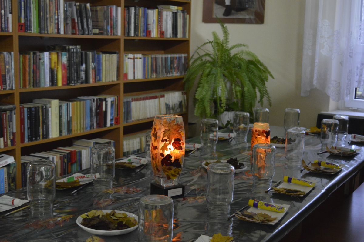 We wtorkowe popołudnie 21.11.2017r w Gminnej Bibliotece zaszumiało kolorowymi liśćmi. Dzieci na zajęciach tworzyły kompozycje z różnobarwnych jesiennych liści, które później przyklejały na szklane naczynka. Co w końcowym efekcie dało piękne, kolorowe podświetlone świecami lampiony z liśćmi. Zabawy i pomysłów na stworzenie własnego lampionu nie zabrakło dzieciom. Wszystkie były śliczne.