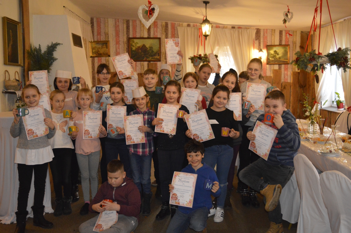 Tegoroczne ferie rozpoczęliśmy od smakowitych zajęć w tajemniczej kuchni… wraz z prawdziwym czarodziejem smaków – Panem Marcinem – przygotowaliśmy przepyszne gofry, babeczki, pasty kanapkowe, a nawet tort! Kolejnego dnia wybraliśmy się na wycieczkę do kina, obejrzeliśmy film pt. „Królewna śnieżka i fantastyczna siódemka”, który opowiadał o tym, że wygląd to nie wszystko, a naprawdę pięknym jest ten, kto jest dobry… środę natomiast spędziliśmy w muzeum im. Konstantego Laszczki w Dobrem, gdzie mogliśmy się poczuć jak prawdziwi artyści! Następnie ponownie zawitaliśmy w kinie, obejrzeliśmy film „Gang zwierzaków”, który wprawił wszystkich w doskonały nastrój. Ostatni dzień ferii także był pełen wrażeń: stworzyliśmy wyjątkowe koszulki, zjedliśmy pyszne tosty, a nawet zdążyliśmy zorganizować krótki seans filmowy. Każdego dnia w zajęciach organizowanych przez Gminny Ośrodek Kultury w Dobrem brało udział około czterdziestu uczestników. Z niektórymi widzieliśmy się codziennie, inni brali udział w wybranych zajęciach lub wyjazdach, najważniejsze jednak, że dla każdego znalazło się coś dobrego. Do zobaczenia niebawem!