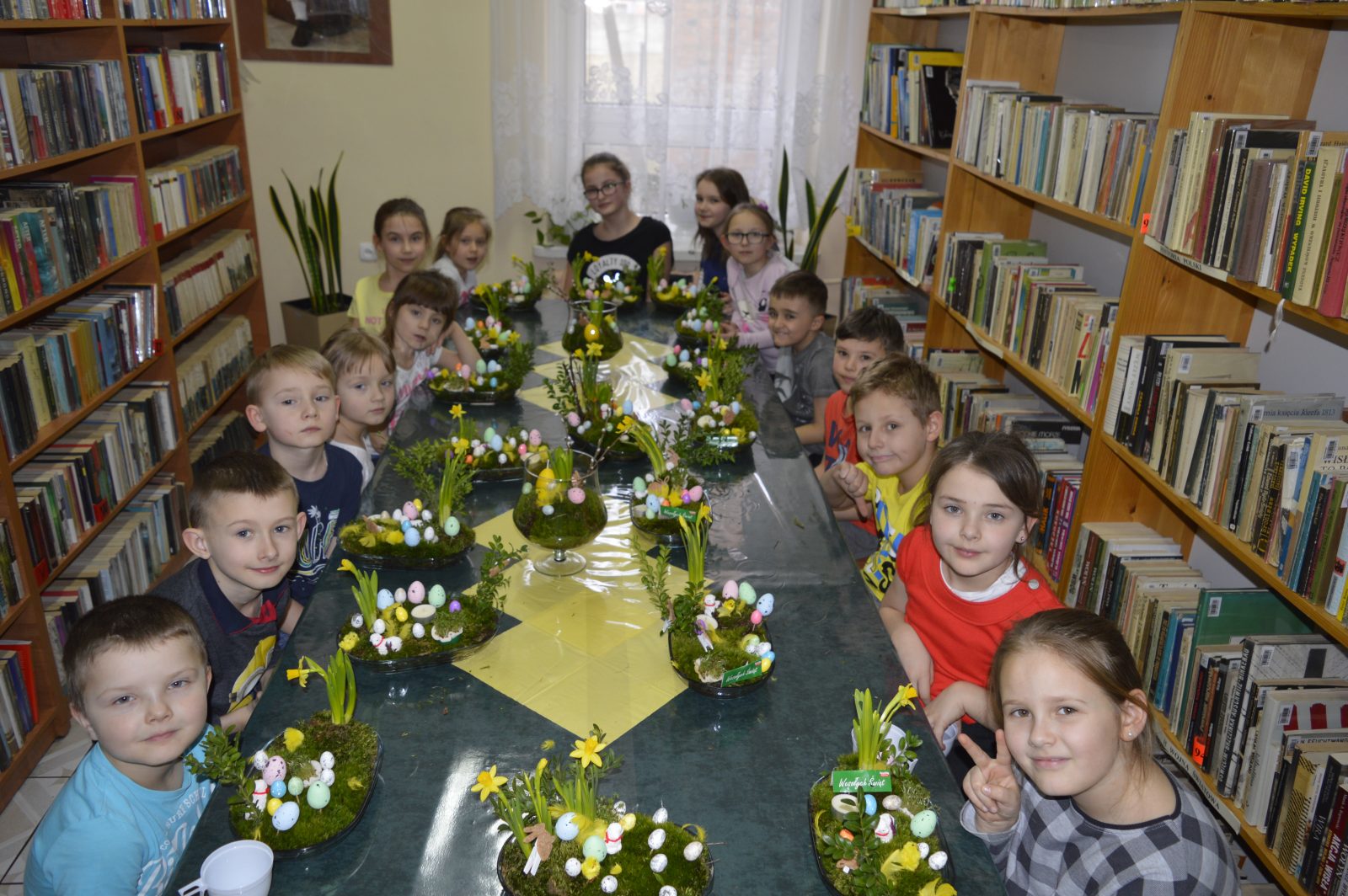 28 marca w Czytelni Gminnej Biblioteki grupa dzieci dekorowały świąteczne ciasteczkowe jajka, baranki i kurczaczki. Szybciutko ciasteczka zamieniły się w kolorowe pisanki, które każde dziecko mogło pięknie ozdobić. Później przyszła kolej na świąteczny stroik wykonany z mchu, żonkili i różnobarwnych jajeczek. Nie zabrakło, gipsowego baranka, króliczka i kurczaczka. Po skończonych zajęciach dzieci swoje piękne ciasteczkowe jajeczka i stroiki zabrały do domu, aby ozdobiły stół na Wielkanocnym śniadaniu.