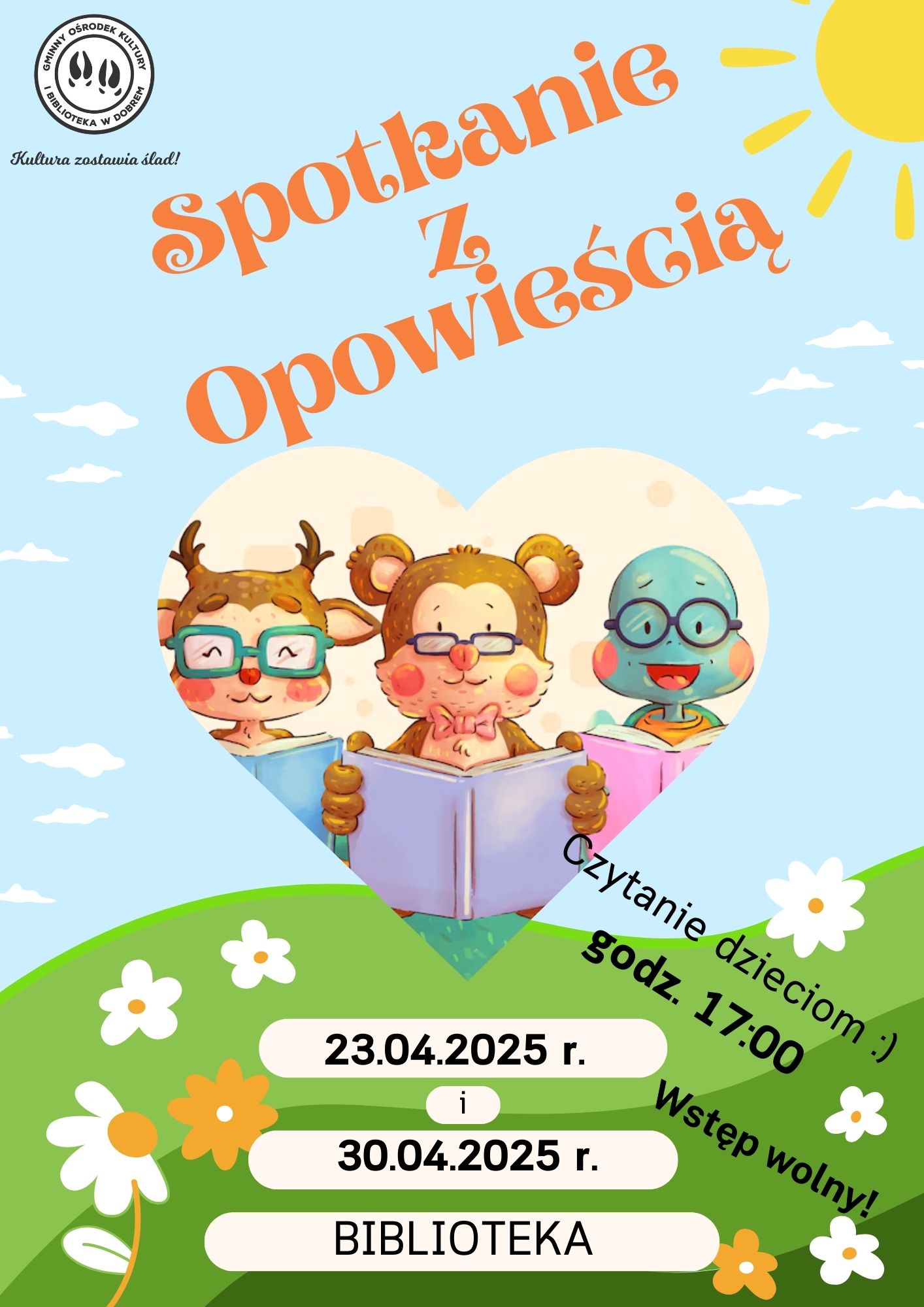 Kochani rodzice i mali czytelnicy!  23 i 30 kwietnia 2025 roku o godzinie 17:00 w naszej bibliotece odbędą się Opowieści dla Dzieci.